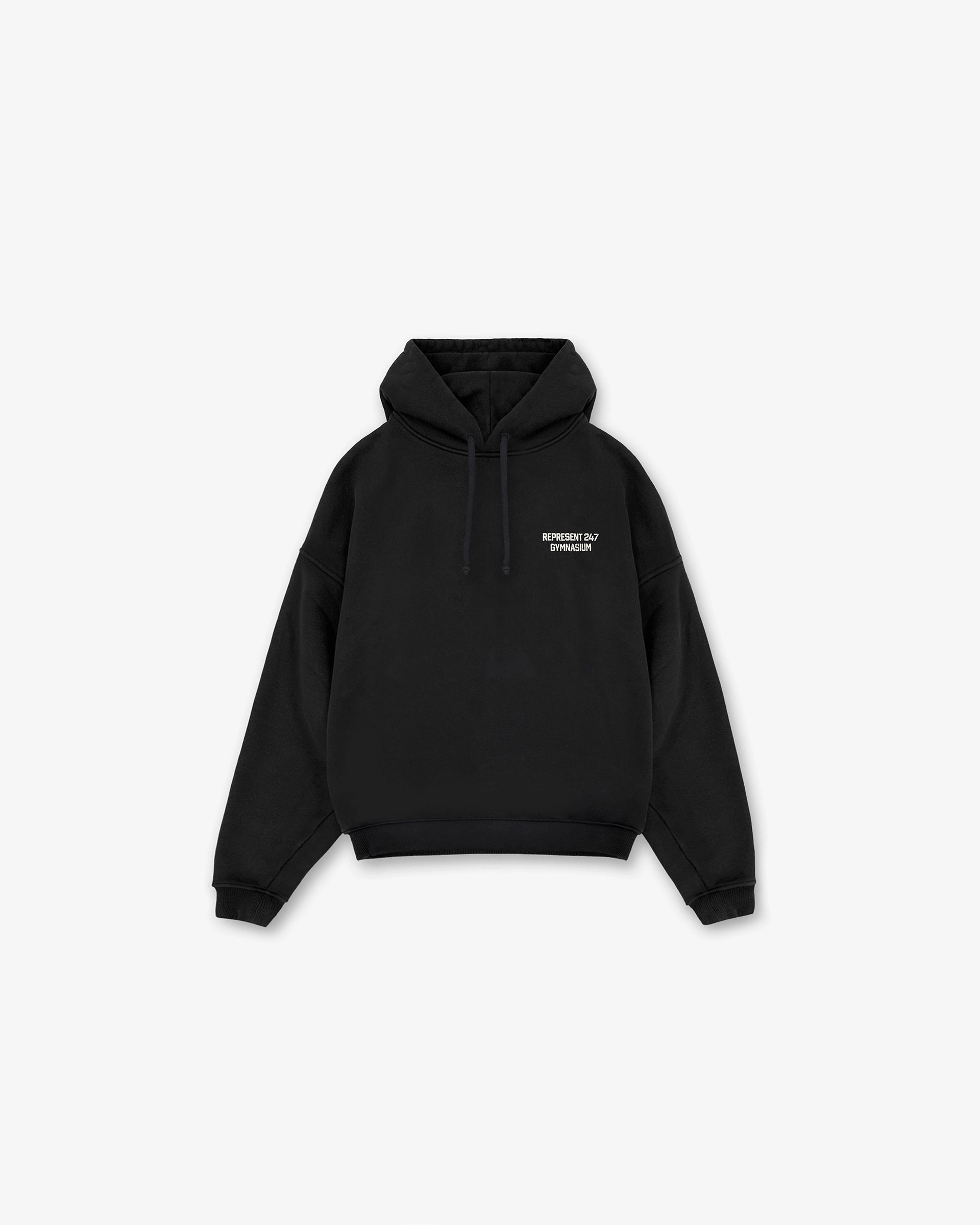 Introducing the 247 Gymnasium Boxy Hoodie in Off Black, a relaxed boxy fit hoodie with a cropped body. The hoodie, crafted from a heavyweight fleece back cotton, has a ribbed hem and cuffs and external knotted drawcord to the hood for an adjustable fit. It has a cracked style Represent 247 Gymnasium print to the front and back with a 247 logo to the hood.