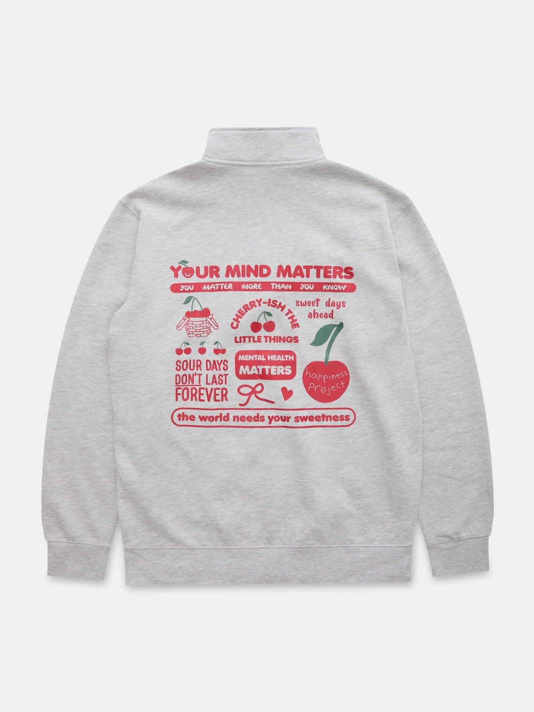 Sweet comfort with a powerful message. The Cherry Quarter Zip combines soft gray fabric with bright red graphics that remind you to care for your mind and celebrate progress. With its playful cherry detail on the front and uplifting message on the back, it’s the perfect mix of cozy and bold. Every quarter zip sold supports suicide prevention.