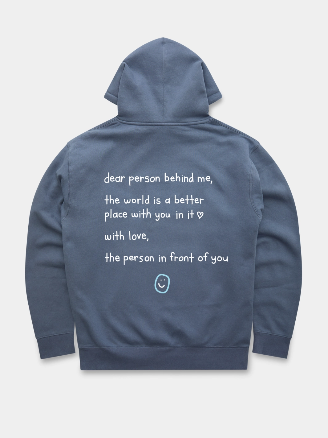 A reminder that we’re all in this together. The Dear Person Behind Me Hoodie features a soft blue tone and a powerful message on the back reminding others they’re not alone and they matter. Cozy, meaningful, and full of heart, this piece spreads kindness with every wear. Every hoodie sold supports suicide prevention