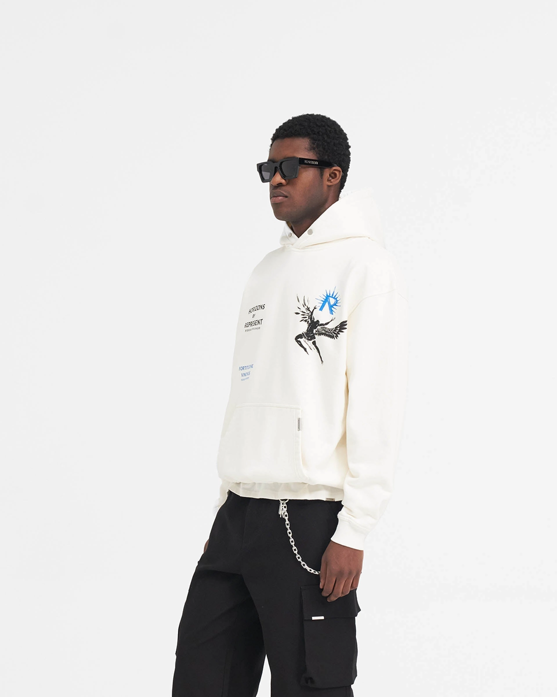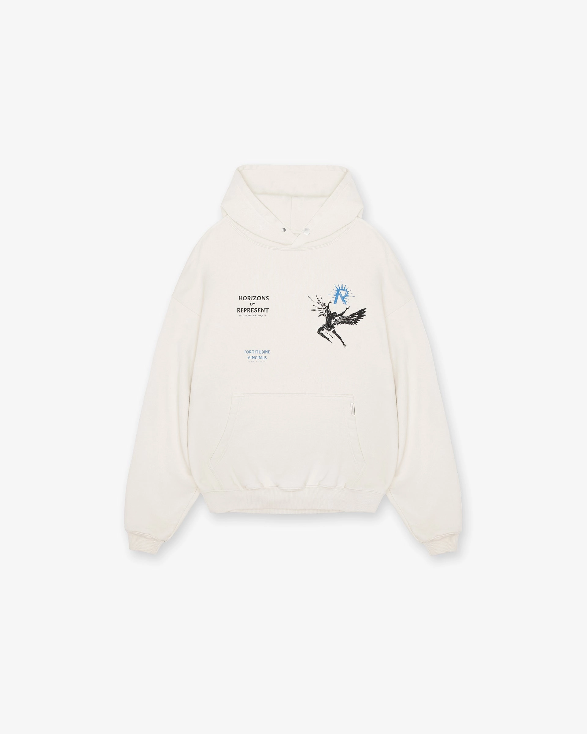 Introducing the Icarus Hoodie in Flat White, a luxury hoodie crafted with an oversized fit. The hoodie has a ribbed hem and cuffs and is finished with a Represent metal bar to the pocket and Cobrax popper to the hood.
