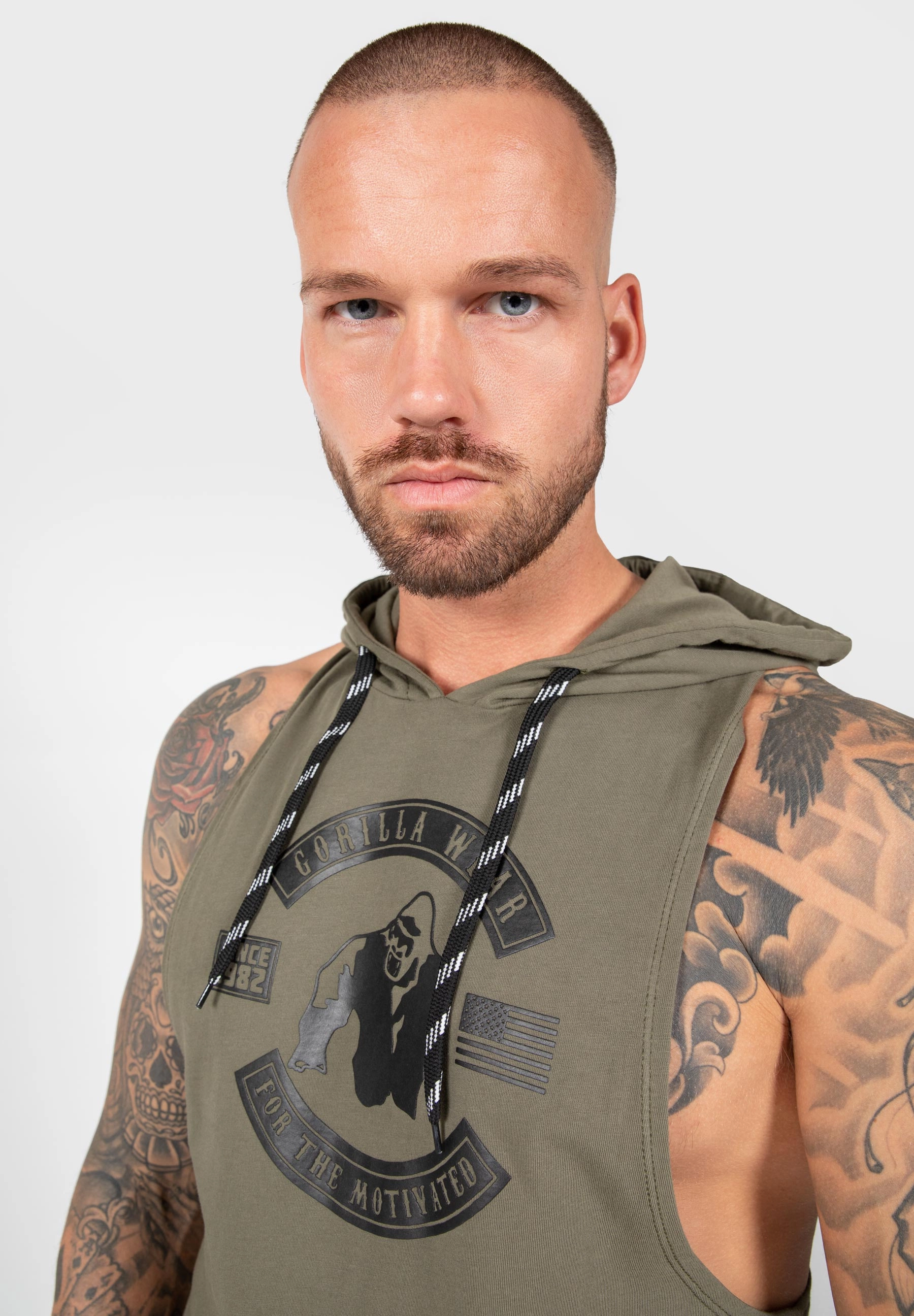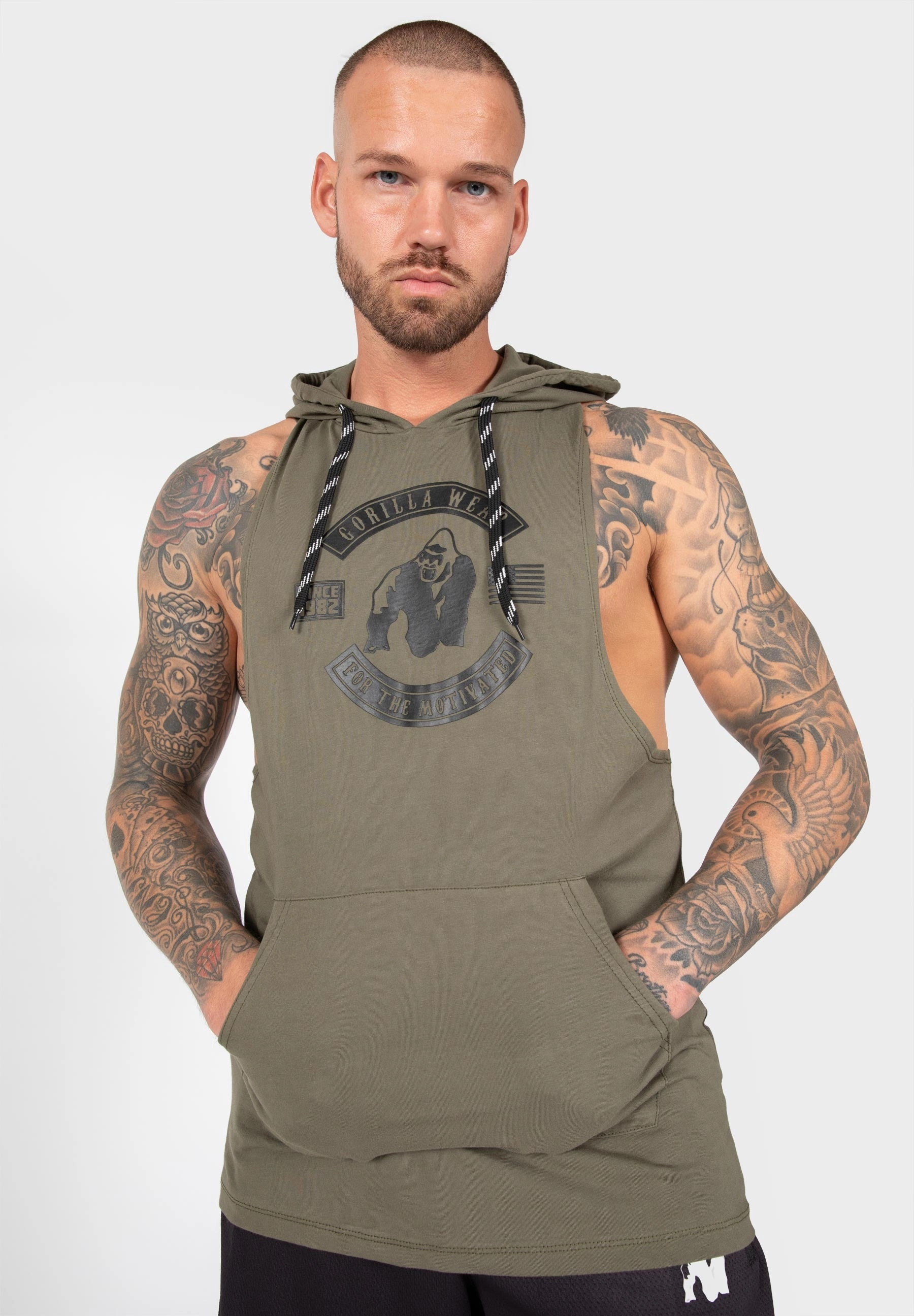 The Lawrence Hooded Top is an ideal tank to show off your big arms. This is great for times when it is too cold to wear a tank top, or when it is too warm to wear a long sleeve hoodie; in this case, wear the Lawrence Hooded Tanktop! This hoodie gives you a free feeling around your arms while keeping your core dry, covered, and comfortable. Engineered Gorilla Wear print on the back adds a sense of amazing style and design. This hoodie has kangaroo pockets on the front and drawstring around the hood. It's time to show the people that you are a member of the GORILLA WEAR Family where you can choose between the colors Army Green, Navy, and Black.
