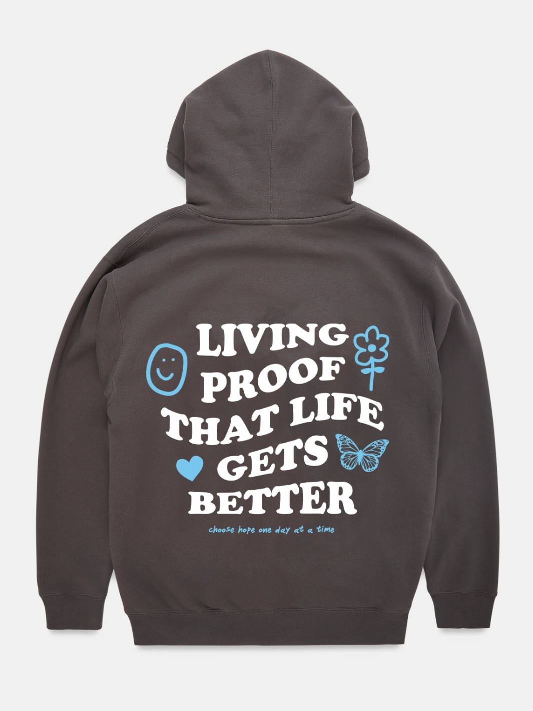 We designed the Living Proof Hoodie as a powerful reminder that life does get better, even when it’s hard to see. Featuring blue accents on the back and the message “Living proof that life gets better; choose hope one day at a time,” this thick, cozy hoodie is a symbol of resilience and hope. Every hoodie sold helps support suicide prevention.