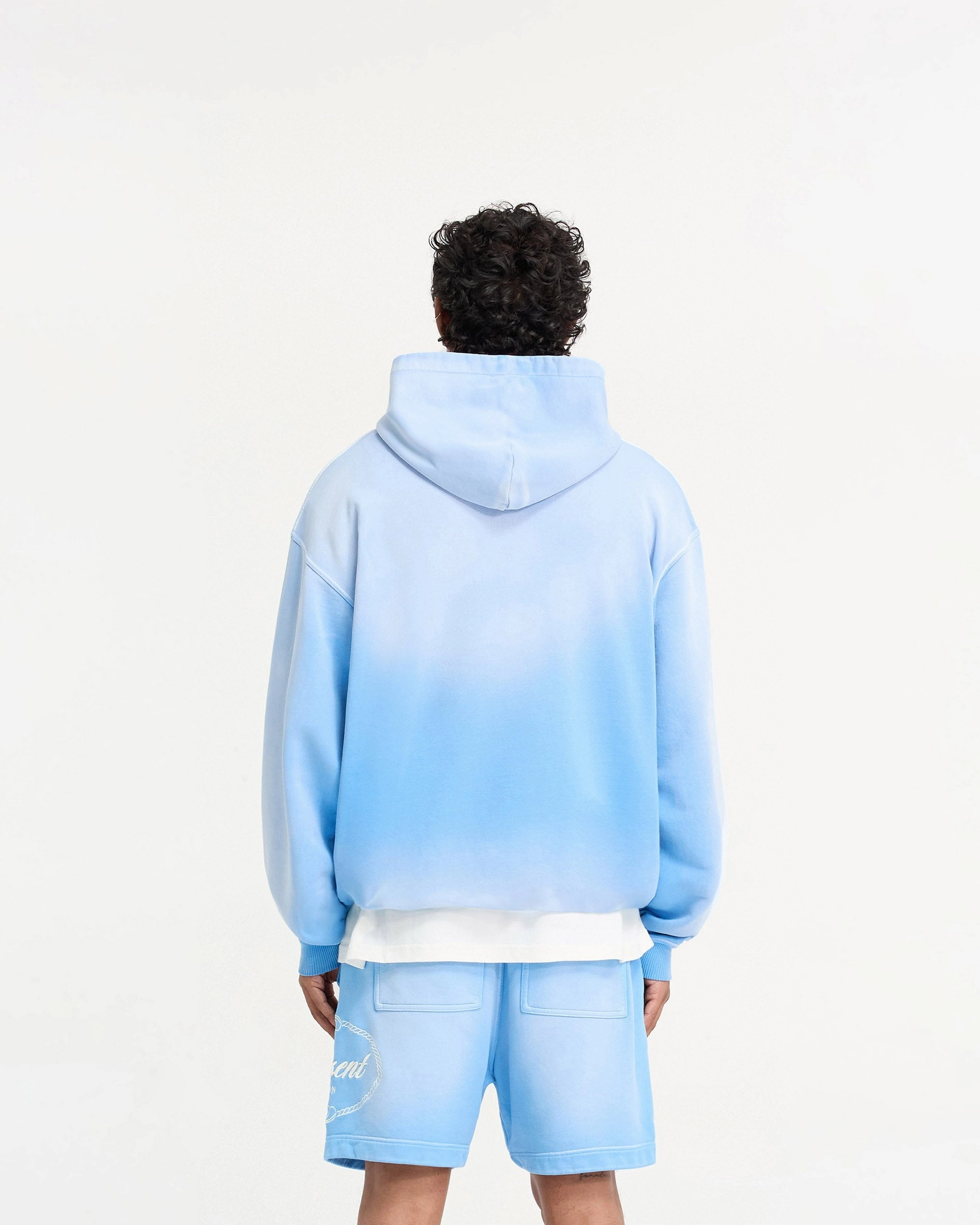 Introducing the Represent x Harrods Crest Hoodie in Cloud Blue, a luxury slightly oversized hoodie with a gradient cloud blue wash with spray applied, crafted from heavyweight jersey cotton. The hoodie showcases a high build embroidered crest to the front, flatlock stitching to the pocket, with a ribbed hem and cuffs. It is finished by a Represent metal bar logo to the pocket and Cobrax popper to the hood.